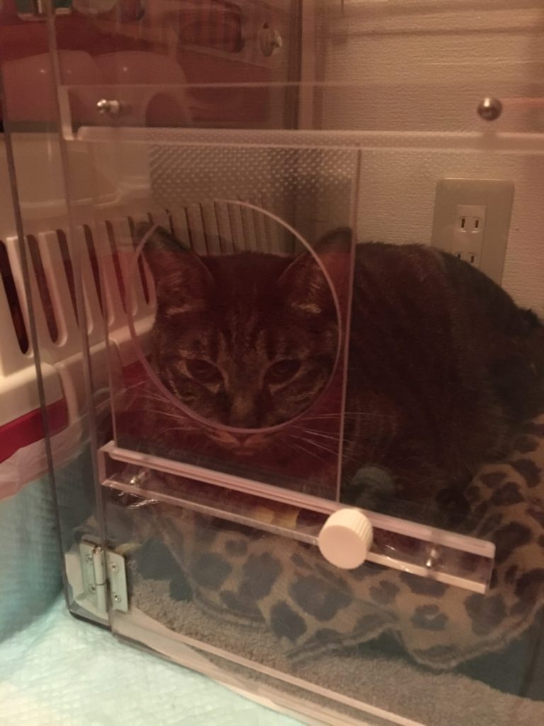 Finally, even that was not enough. Dr. Hirakawa had been reluctant to remove water from the pleura because it was often painful and Blackie was a sensitive cat. Finally he did so under sedation, and Blackie was a bit better having had 300 ml of fluid removed.